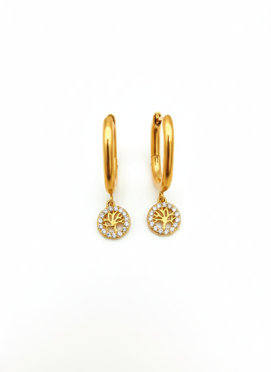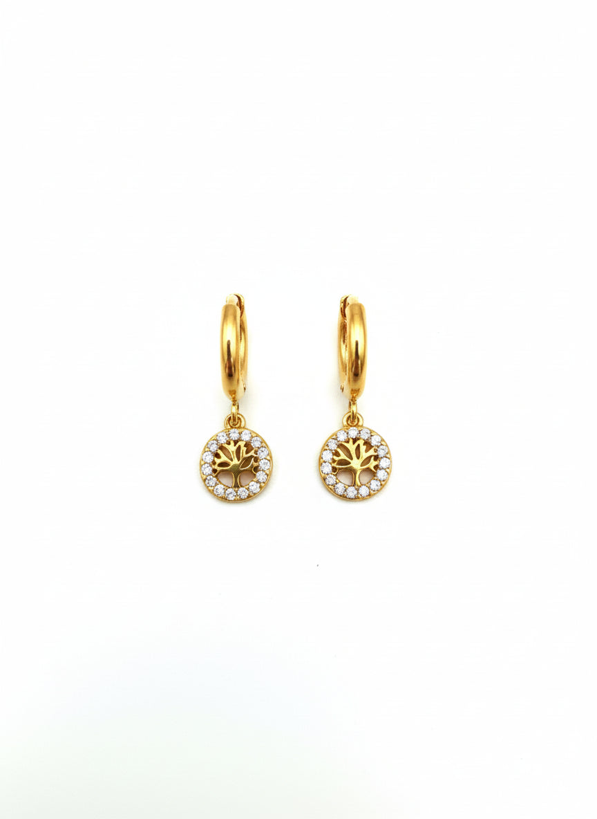 Gold Toned Tree of Life Diamate Huggie Earrings